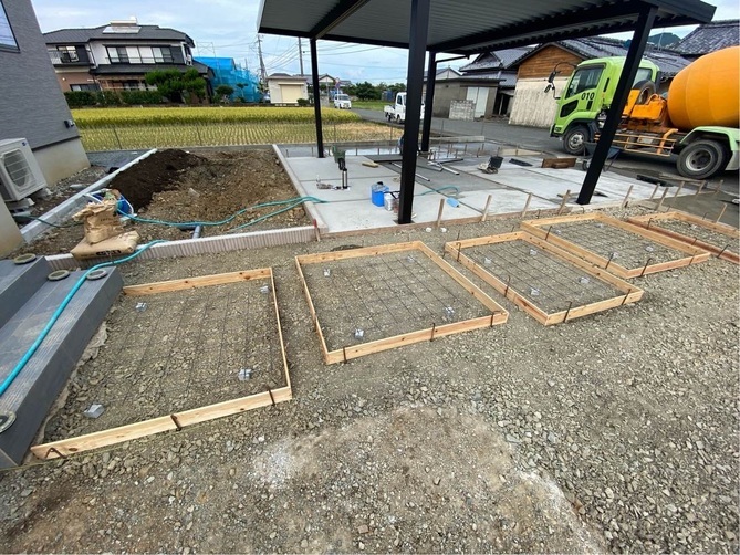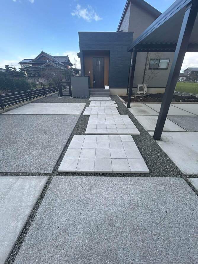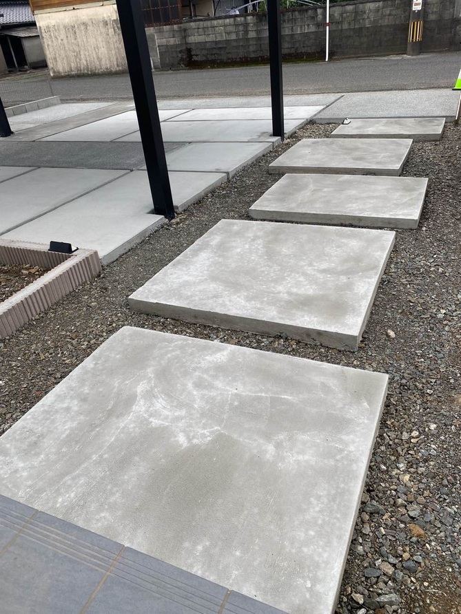 お客様が既に設置しておられたカーポートに合わせて駐車場土間、アプローチの施工を行いました。