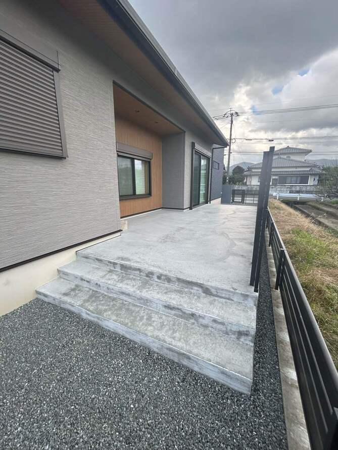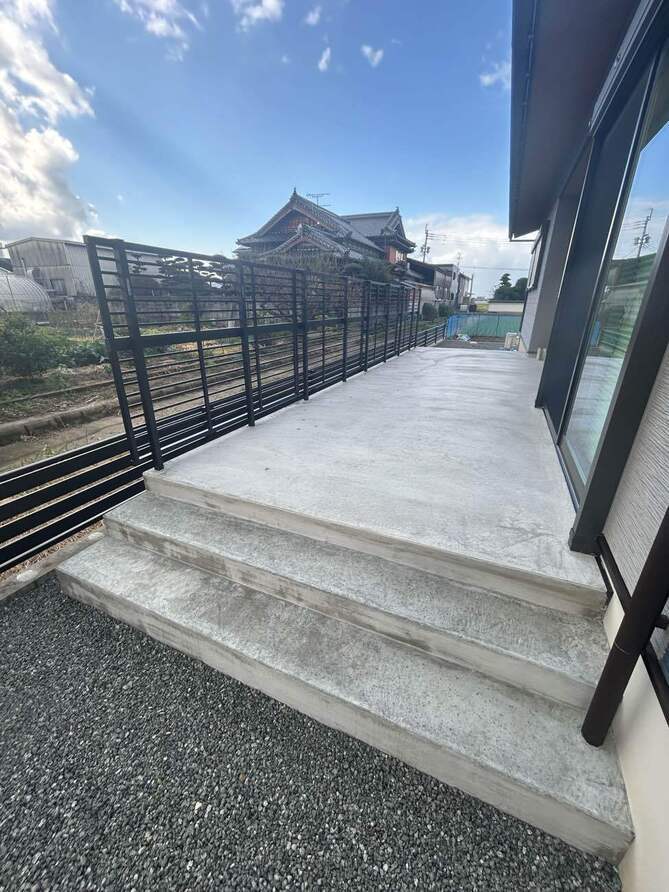 また、ジョリパットにて仕上げた門柱、お庭側のコンクリートデッキはお客様のご希望に添って造作させていただきました。